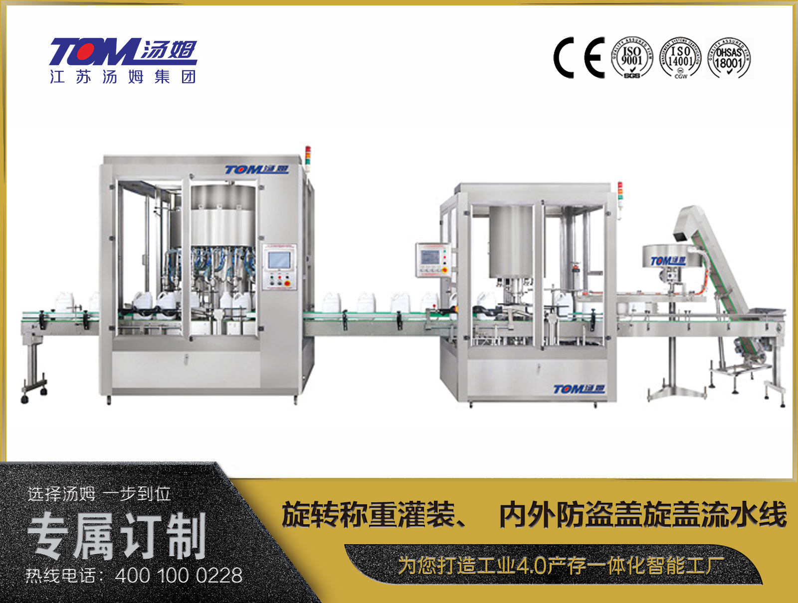 旋轉(zhuǎn)稱重灌裝、內(nèi)外防盜蓋旋蓋流水線