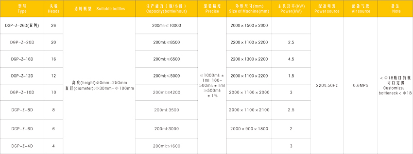 生產能力(1L計)  1800瓶/時  2400瓶/時  3000瓶/時  3600瓶/時  4800瓶/時 6000瓶/時